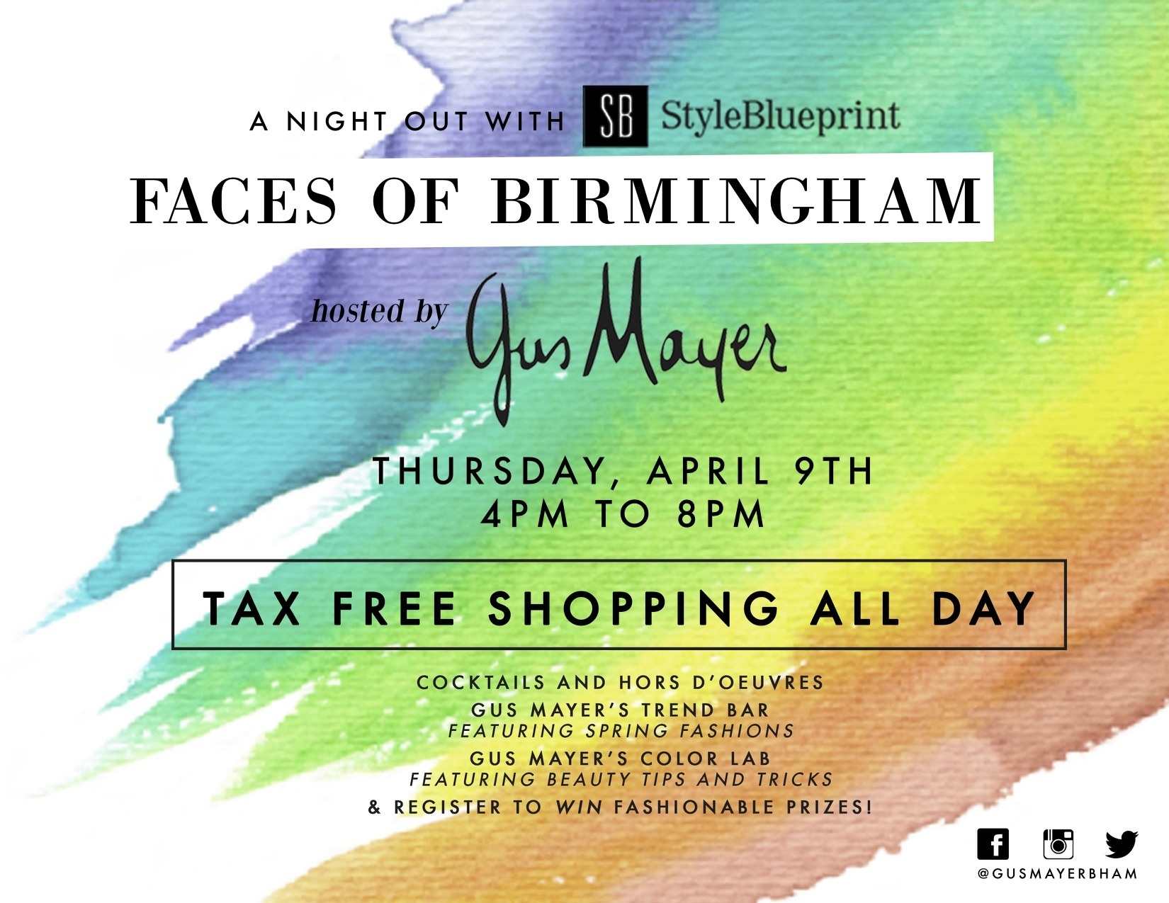 Gus Mayer invites you to enjoy an evening of fashion, fun and (TAX FREE!) shopping this Thursday. Come celebrate StyleBlueprint’s Faces of Birmingham, browse Spring’s hautest trends at Gus Mayer’s Trend Bar, receive beauty tips from the Color Lab and enjoy cocktails and hors d’oeuvres from 4 to 8 p.m. There will also be fashionable giveaways throughout the night!