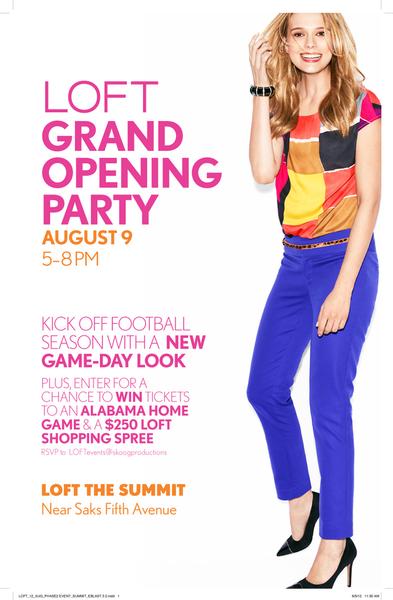 Ten percent of total sales from the Grand Opening event benefited the Junior League of Birmingham’s Shop Save & Share initiative. LOFT is located at the Summit, next to Rosenberger’s Trunk. Shop online now; all full-price pants and denim are $20 off, all sale items are an extra 50% off, and you can get a $25 savings card for every $50 you spend on full-price items now through September 8.